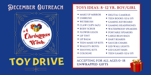 We will be accepting donations for "A Christmas Wish" November 23rd through December 7th in the Lobby.